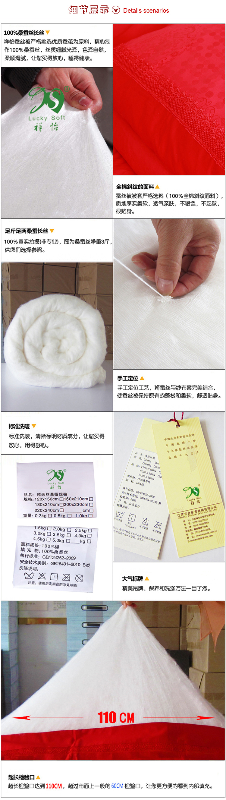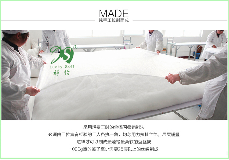 这款被子最大的特点在于胎套,同行大部分都是棉布胎套,而我们这款是纱布胎套(纱布胎套外面配有纯棉被套,110CM超长检测口,可以脱卸洗涤)纱布胎套比棉布胎套更柔软,纱布胎套外黏被套内黏丝,是很好的融合体,而且所有蚕丝一览无疑,凡胎套漂亮,但看不到里面蚕丝的被子很可能“金玉其外,败絮其中”。还有一般同行棉布内胎的蚕丝被就没有外被套,我们用纱套内胎的蚕丝被还外加了全棉被套,买回家直接就可以盖啦,还帮亲们省了买被套的钱呢